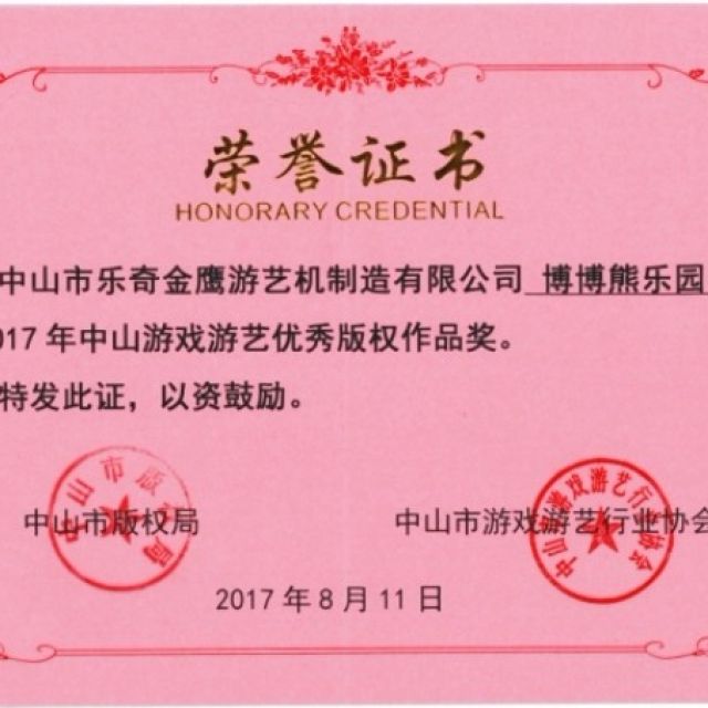 中山市乐奇金鹰游艺机制造有限公司(原中山市金鹰游艺机厂)是专注于碰碰车、旋转木马、火车、摩天轮、儿童爬山车及系列室(内)外大、中、小型游艺机和嘉年华机等游乐产品为生产发展定位的企业,是国际游艺机游乐协会(IAAPA)会员单位和中国游艺机游乐园协会(CAAPA)常务理事单位。