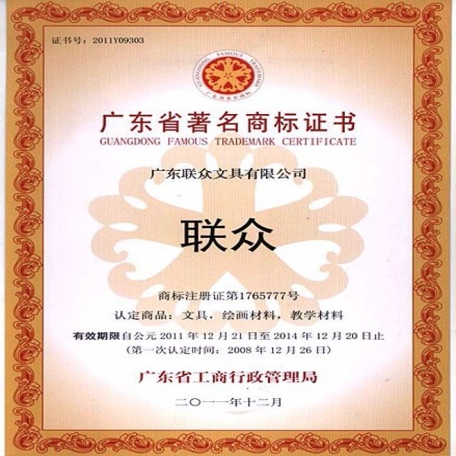 联众公司进入文具行业10余年以来,从一个默默无闻的小厂商,发展成中国学生文具第一品牌;把不到200平方米的小作坊变成了一个在行业内具有影响力的80000平方米的产业化基地。在行业内首家成功导入ERP(企业资源计划)和CRM(客户关系管理)等信息化管理系统、行业内率先通过ISO9001质量管理体系认证与ISO14000国际环境认证管理体系、积极推行SA8000社会责任体系。文具业内率先通过4A级“标准化良好行为企业”认证、国家级高新科技企业。联众还先后主导和参与了笔袋、文具盒、书包、彩泥、手动削笔机、橡皮擦等国家标准、行业标准的制定。也连续多次被行业协会、商会和工商管理机构授予“中国最畅销文具品牌”、“中国十大文具品牌”、“中国文具创新奖”、“文具质量可信奖”、“守合同重信用企业”、“广东省著名商标”、“中国学生文具优秀品牌”“科技创新优秀企业”等荣誉。同时,联众公司是中国文教体育用品协会副理事长单位。这些荣誉一直鼓励着联众公司向国际领先企业目标迈进。