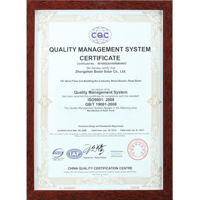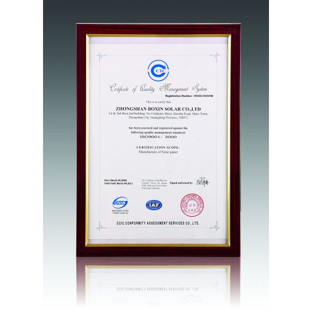 波信太阳能拥有先进的质量检测设备和严格的管理体系,确保产品品质及其稳定性;公司已通过ISO9001:2000质量管理体系认证;产品已通过IEC61215, IEC61730, CE等各类专业认证测试,符合安规、环保等各方面优质标准。