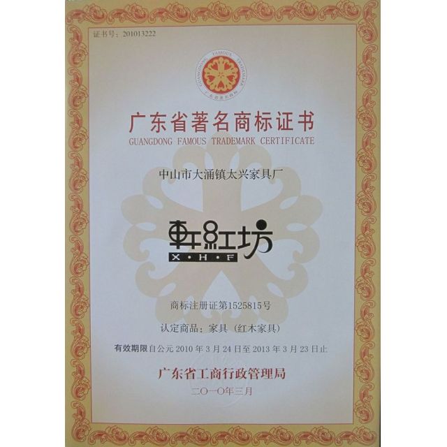 中山市太兴家具有限公司,位于“中国红木家具生产专业镇”“中国红木产业之都” ――广东省中山市大涌镇。自1999年成立至今,现有两大品牌、近百家加盟。先后荣获“广东省著名商标”,“采用国际标准产品”,“国家级AAAA标准化良好行为企业”等称号,是《红木家具通用技术条件》标准起草单位之一。